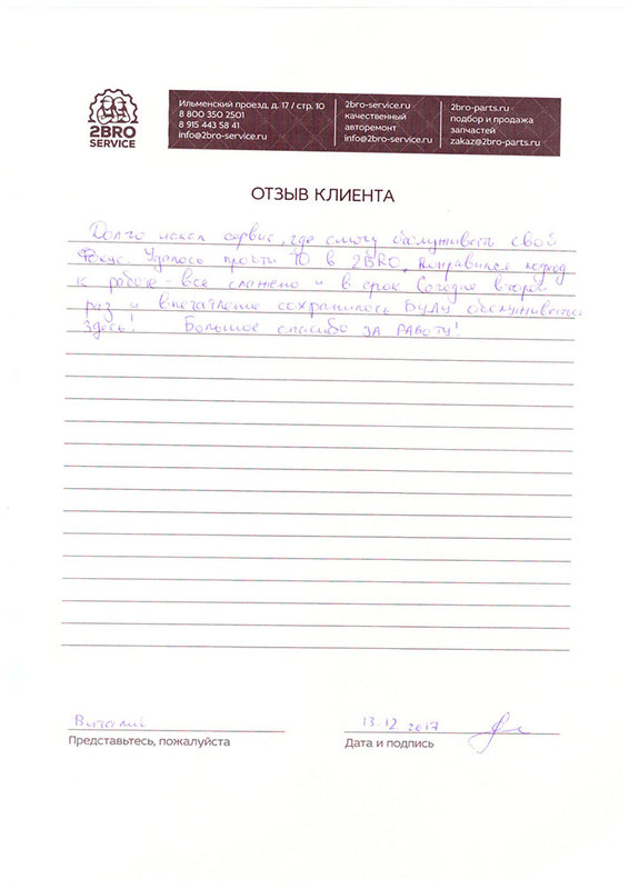Автосервис Форд придерживается основ культуры труда и общей культуры в общении с клиентами. Техцентр не допускает так называемого "развода" на дополнительный ремонт с целью повышения стоимости услуг. Специализированный сервис предлагает качественные услуги, при этом оплата всегда взымается за фактически проделанную работу или комплектующие.