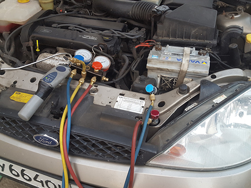 Далее подготавливают необходимое оборудование. Используются компрессор, манометрическая станция, баллон с хладагентом, вакуумный насос и другие инструменты. Выполняют подключение манометрической станции к вентилям системы кондиционирования автомобиля. Обычно используются 2 манометра: один для низкого давления, другой – для высокого.